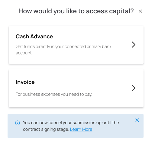 Once you have completed your business profile and connected revenue sources, your dashboard may show a preliminary capacity, with the option to access working capital.